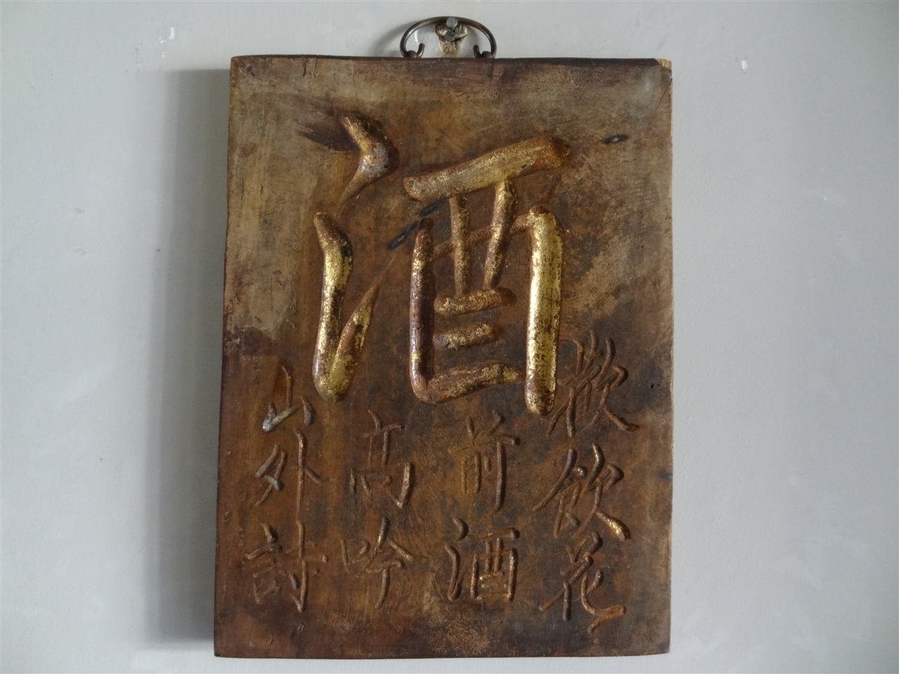 古时候的酒牌也叫酒幌子,是说我的店铺是卖酒的。去年从力高古玩市场淘到了一块非常少见的木制老酒牌子,高37厘米,宽28厘米,厚2.5厘米,因上面没有年款,所以无法准确对它做出年代的判断,大约民国时期的。牌子上端装有白铜质的挂把,酒牌上面的字都是雕刻出来的,刚劲有力,并且还描了金漆,因时代久远,下面的小字上的金漆大都已脱落。正上方写着很大的酒字,下面写着“双饮花前酒,高吟山外诗”,这两句诗写到了极致,说出了饮酒者与文人的一种境界。