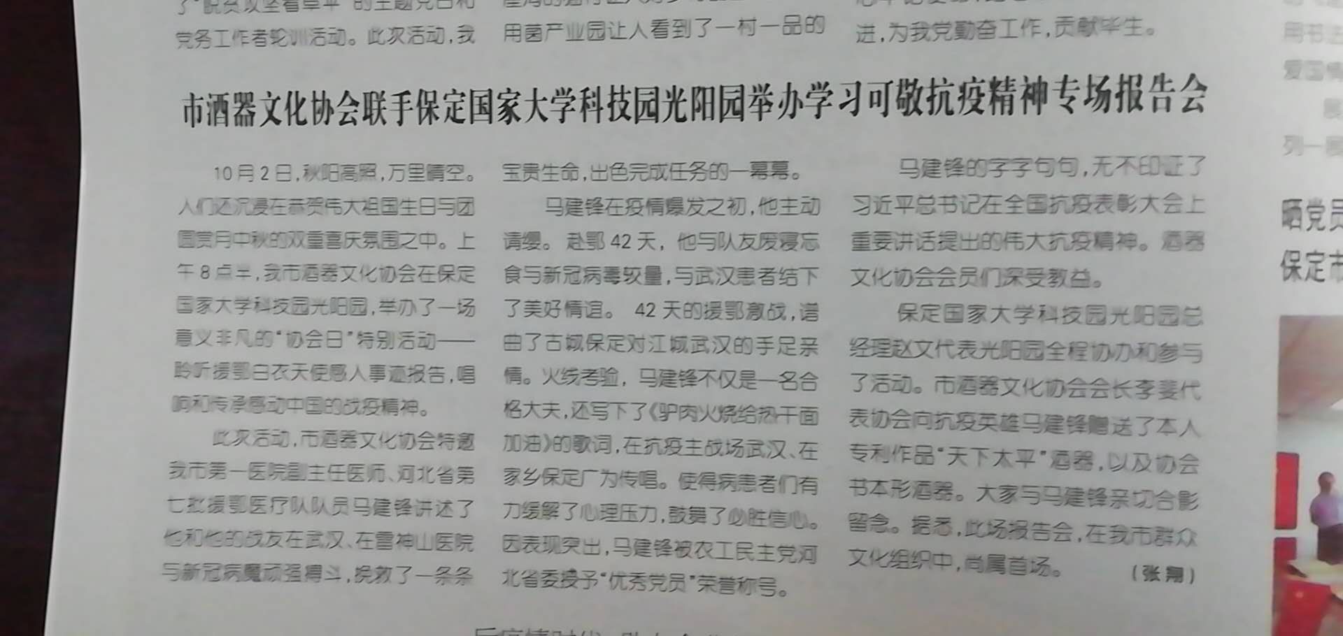 市酒器文化协会联手保定国家大学科技园光阳园举办学习可敬抗疫精神专场报告会