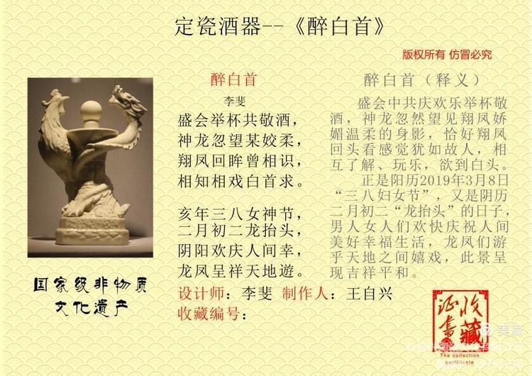《醉白首》酒器是由保定市酒器文化协会会长李斐设计,自兴陶瓷文化有限公司负责人王自兴创作制作完成。