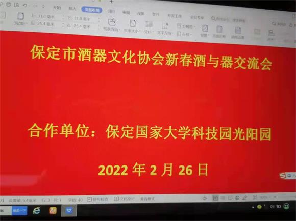 艺海文化网(王雨报道)2022年2月26日,保定市酒器文化协会在保定国家大学科技园光阳园举办新春酒与器交流会,本次活动得到了此单位的大力支持和帮助,活动圆满成功。