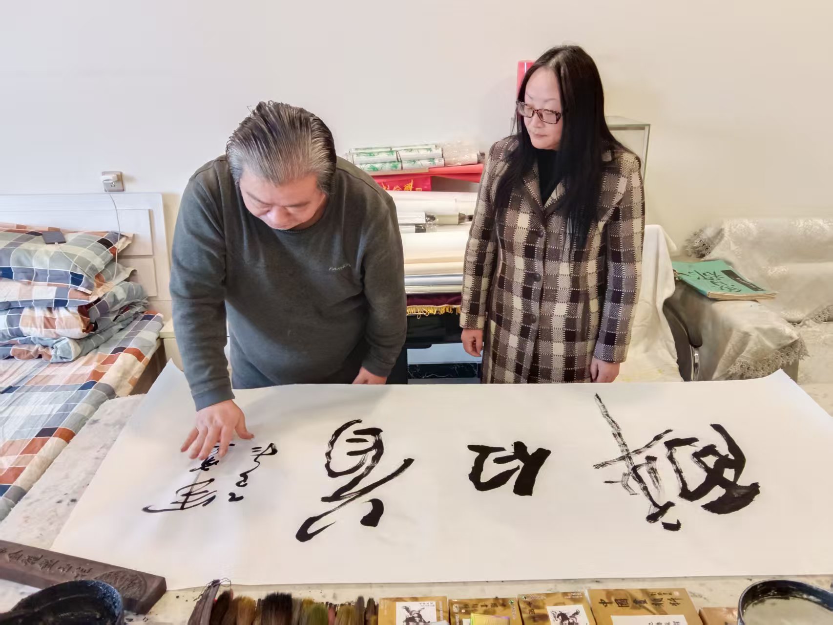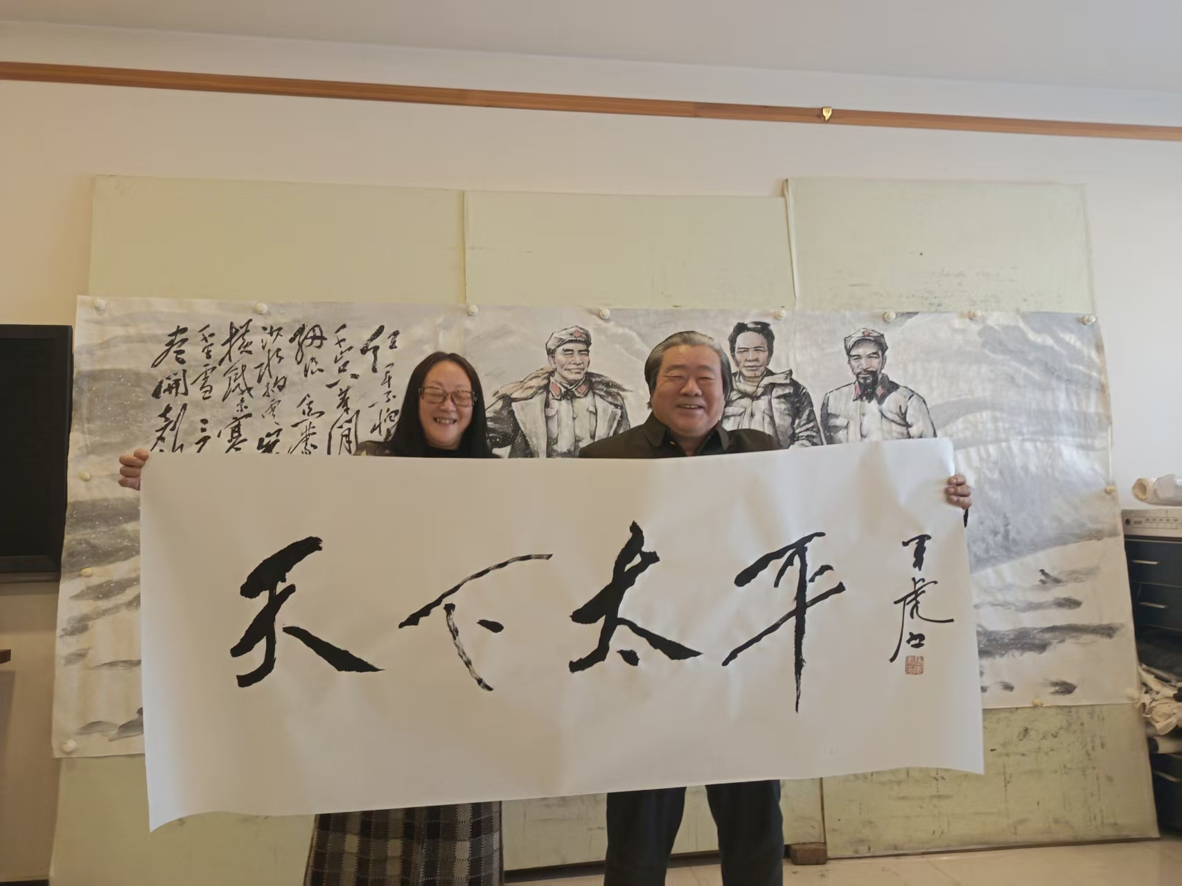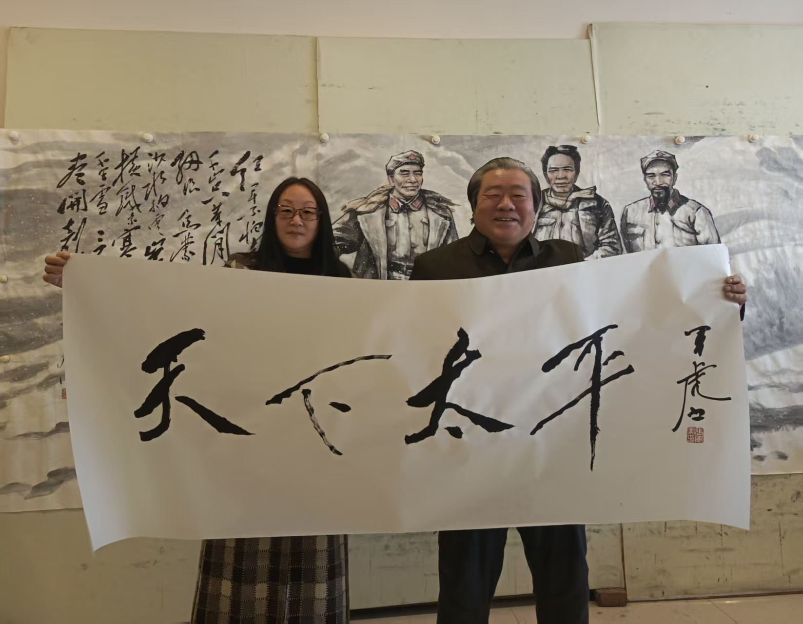 《天下太平》,张老师笔画刚劲有力,兼具豪迈气概与端庄风骨,完美诠释毛体书法的独特神韵。“天下太平”四字意蕴深远,承载着国泰民安的美好愿景。