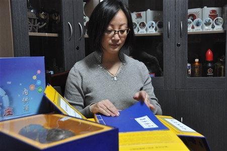 (图片简介:李斐,曾用名李海岩,籍贯河北省安国市人,1970年出生于沈阳市。于2007年9月9日在保定市育德会馆酒店有限公司的大力支持下展出了酒瓶藏品中的一小部分。同时也成为了保定市收藏酒瓶爱好者让酒瓶文化走进酒店的第一人。她是保定市酒器文化协会会长,保定市作家协会会员,河北省民间协会会员,中国收藏协会会员,中外酒器文化协会副主席。)