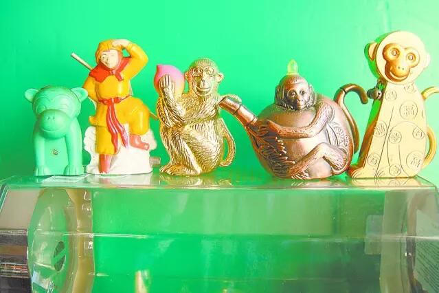 于是,王忠友只要遇见和猴沾边的物品,都舍得花钱买下。如今在他的藏品中,与猴有关系的题材物品有邮票、酒器、打火机、玉石猴印、铜猴、均瓷猴、剪纸猴、挂历猴、猴币等,下面就看看他的猴族成员吧!