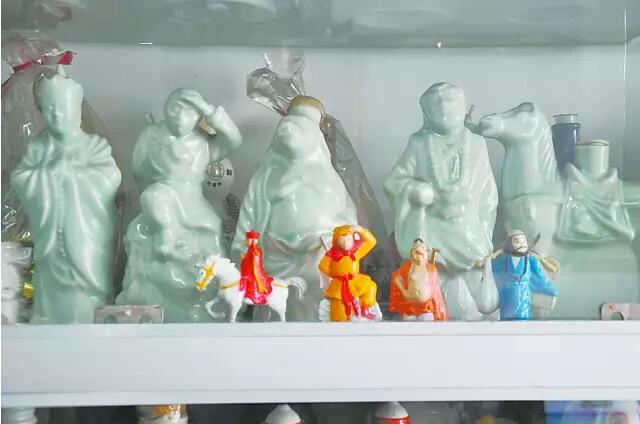 王忠友的家简朴整洁,酒器是唯一的装饰品。客厅里的三只柜子摆得满满当当,电视柜上下也都是造型各异的酒器。走进老人的书房,更是为映入眼帘的酒瓶惊叹。仔细观察才发现,这些酒器并不是被随意放置,而是按照主题分门别类,有金陵十二钗系列、三国系列、西游系列、京剧脸谱系列、四大美女系列、十二生肖系列等。“实在是放不下了,还有很多在地下室里。”王忠友说。