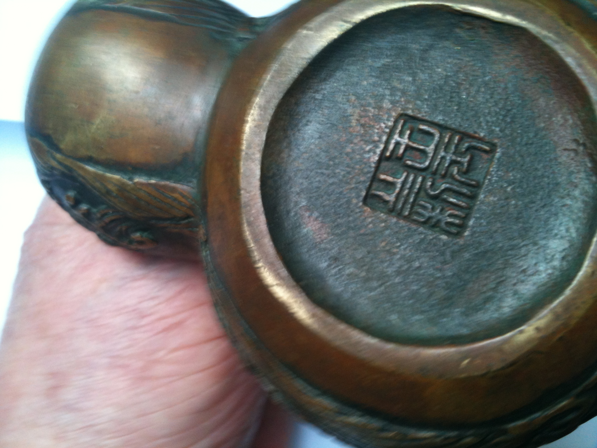 2006年我在保定北唐古玩市场地摊上淘得这个带西游记的铜葫芦酒壶, 这个铜葫芦酒壶是一个壶嘴和壶体连成一体, 提粱卧姿式的酒壶, 它身长12厘米,高8厘米壶嘴处直经4厘米,大肚部位直经7厘米,葫芦腰部上端设一园孔是注酒孔,上有盖,盖上横卧着一个身长两厘米,高一厘米的小葫芦为纽,壶底有隶书体王玉兰名款。