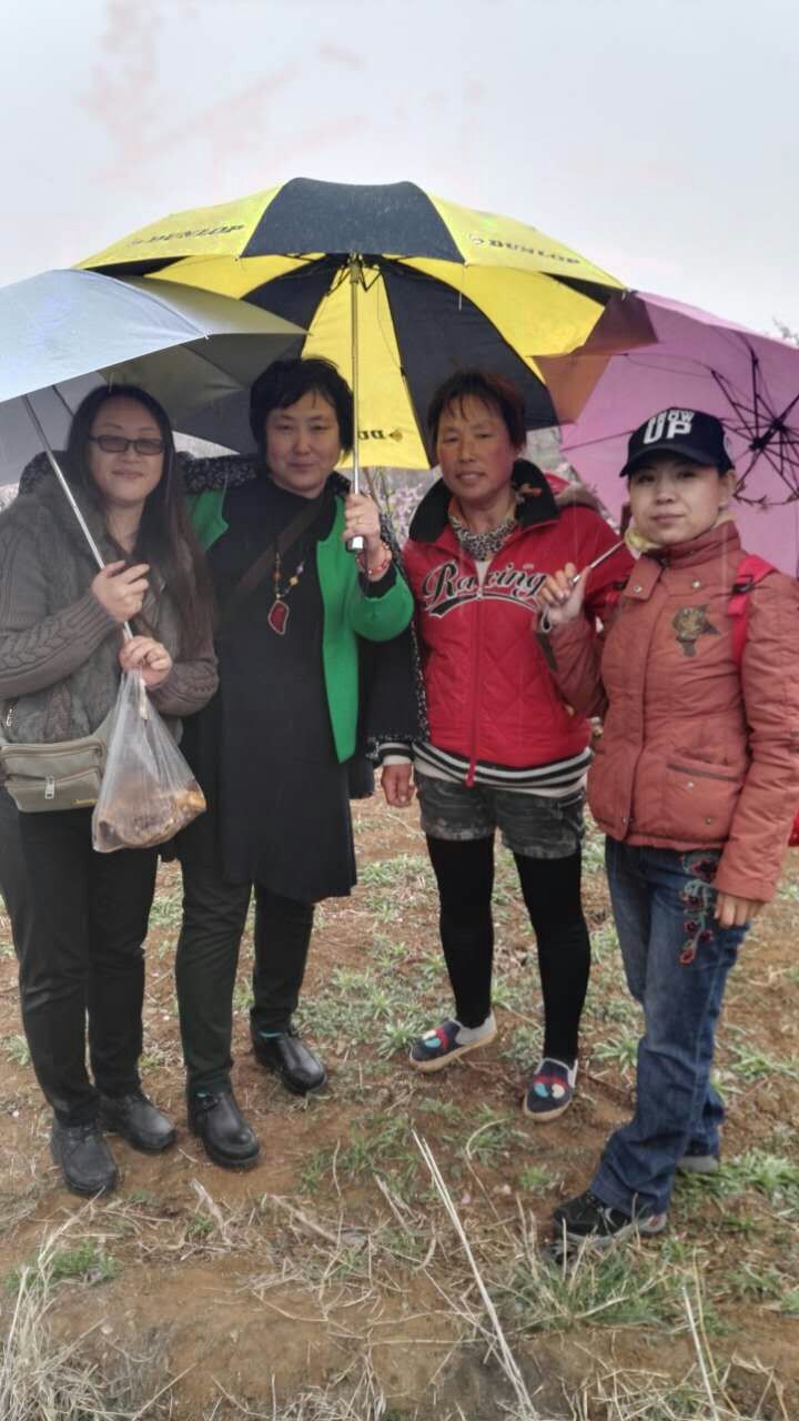开往凤凰山时,副会长杨焕涛的车前右胎被扎爆了。大家伸出援手,帮着拿工具的,捡石头挡后胎的,卸右前胎的,打伞的,崔强老师现场补胎,气泵打气,可是车胎扎的口子过大,只好拉着车胎去补胎。此时,天空仍下着小雨,空气格外的清新,身处桃花海洋,略有些凉和饿。这时袁振甲老师领着燕子水村的书记翟祯杰夫妇来到了面前,给我们送来山药面饼卷鹅蛋片和大葱等,他们的纯朴之心深深的打动了我们,真有点雪中送炭感觉,一股暖流顿时流到了心里。