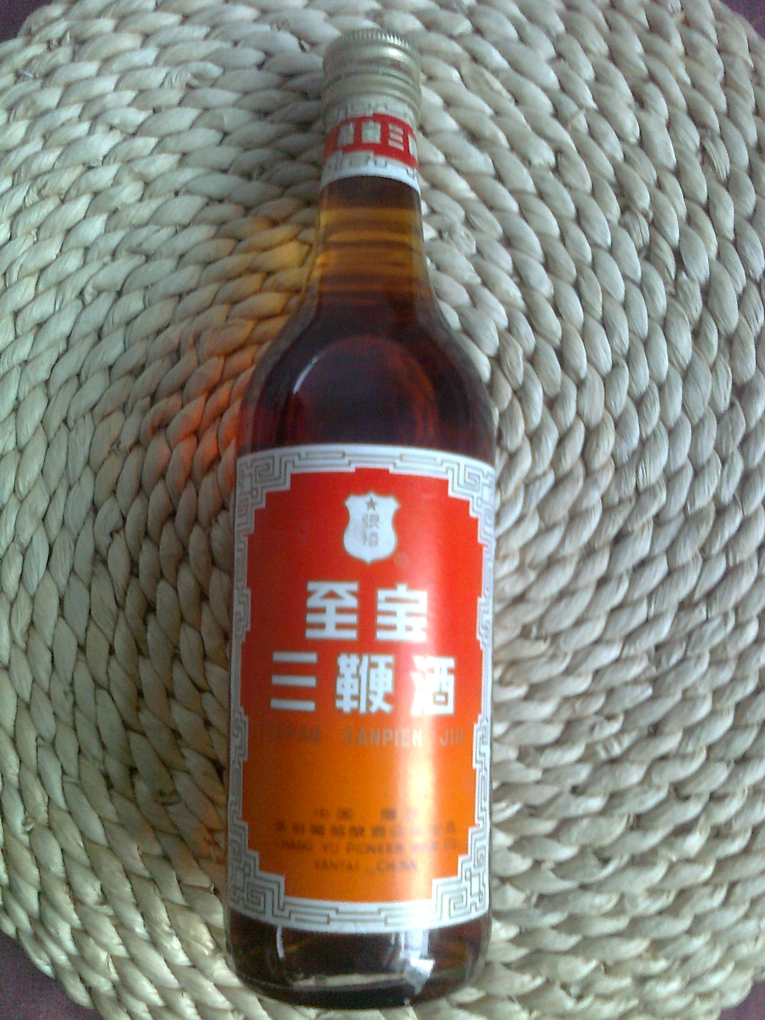 近日,我淘到一瓶品相完好的至宝三鞭酒,此酒产于1999年,由烟台张裕葡萄酿酒公司出品,距今已有15个年头。 该产品呈金黄色, 35度,由高梁酒,海狗鞭、梅鹿鞭,广狗鞭及多种中药组成。此酒酒香协调、柔和适口、回味悠长、风格独特,适量饮用精神焕发、体力充沛,深得国内外人士欢迎。 此产品于1979年至今多次被省、轻工部及国家评为优质产品奖。由于这种金属盖密封性能好,酒液清澈透明,令人爱不释手。