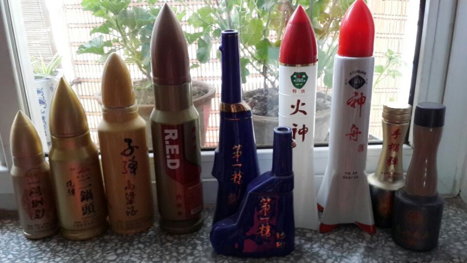 对于我国军工酒器的出现,大都是改革开放后近些年的作品。高端的军工酒器有歼击机,核潜艇,南昌起义第一枪(长、短枪)等;一般产量较多的有火箭、炮弹、手雷、手榴弹、地雷等。相对一些如大炮、高射炮、坦克、机枪、子弹箱、军靴等一些军事题材的酒器,还是中国台湾出品量较大。