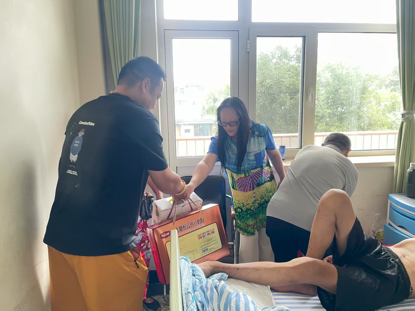 保定市酒器文化协会会长、党支部书记李斐,于7月28日上午和环卫清洁工苑改玲大姐取得联系,预约8月初到家中看望她,当知道她的老公得病住院了,第二天上午同协会党员干部们携带礼品到省医院去慰问,为她们带来了米、面、油、鸡蛋、牛奶、海参蛋白肽粉、高钙豆奶粉、虾仔酱、苹果、口罩等礼物。