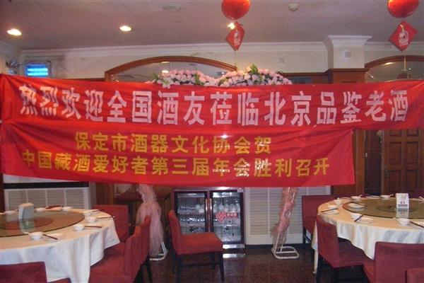 11月19日,保定市酒器文化协会应邀参加了在北京举行的中国藏酒爱好者第三届年会。协会中郝宝印、刘柱、赵向军等代表参加了这次盛会。那里云集了很多来自全国各地有名的藏家、藏品。他们还到歌得拍卖公司进行了观摩,那里有一些五六十年代的老“茅台”酒,实属罕见,机会难得。
