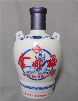 1999年初,邮电体制改革后,分为邮政和电信两大行业。1998年,我在原邮电系统退休。之前,我的儿子曾在邮政上工作了两年,后又调到电信工作,现儿媳和至亲七人在邮政局工作。我和邮政局有很大的因缘,因此这个“金邮福”酒瓶,对我来说就更有纪念意义了。何况,它还有着“今有福”的谐音呢。