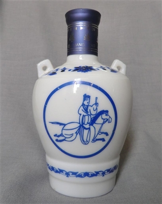 这是个白瓷瓶,图案是一古装打扮策马飞奔的“官儿”,上有“金邮福”邮政物流配送酒的红字。这马的图案很令我喜欢,因本人属马。但我也开始琢磨此图案的出处。图案中骑马的“官儿”应是封建王朝时期传送军政公文的信使,但它是哪朝哪代绘画的呢?我却茫然。